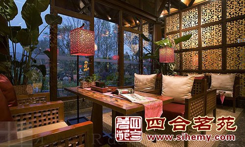 沒有奢華的描金彩繪但是傳統的木結構和中式的花格燈飾自然之美更加吸引觀者的目光,設計色彩簡單但不單調奢華的氣氛充盈了整個空間。